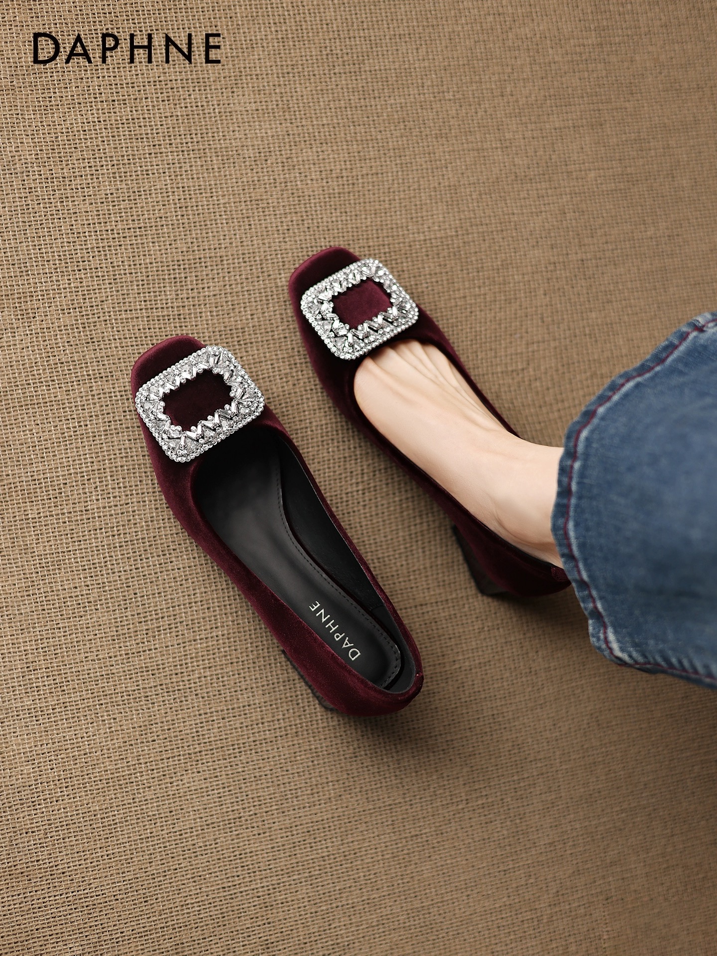达芙妮红色绒面单鞋女2026新款气质配秀禾婚鞋水钻方扣粗跟浅口鞋
