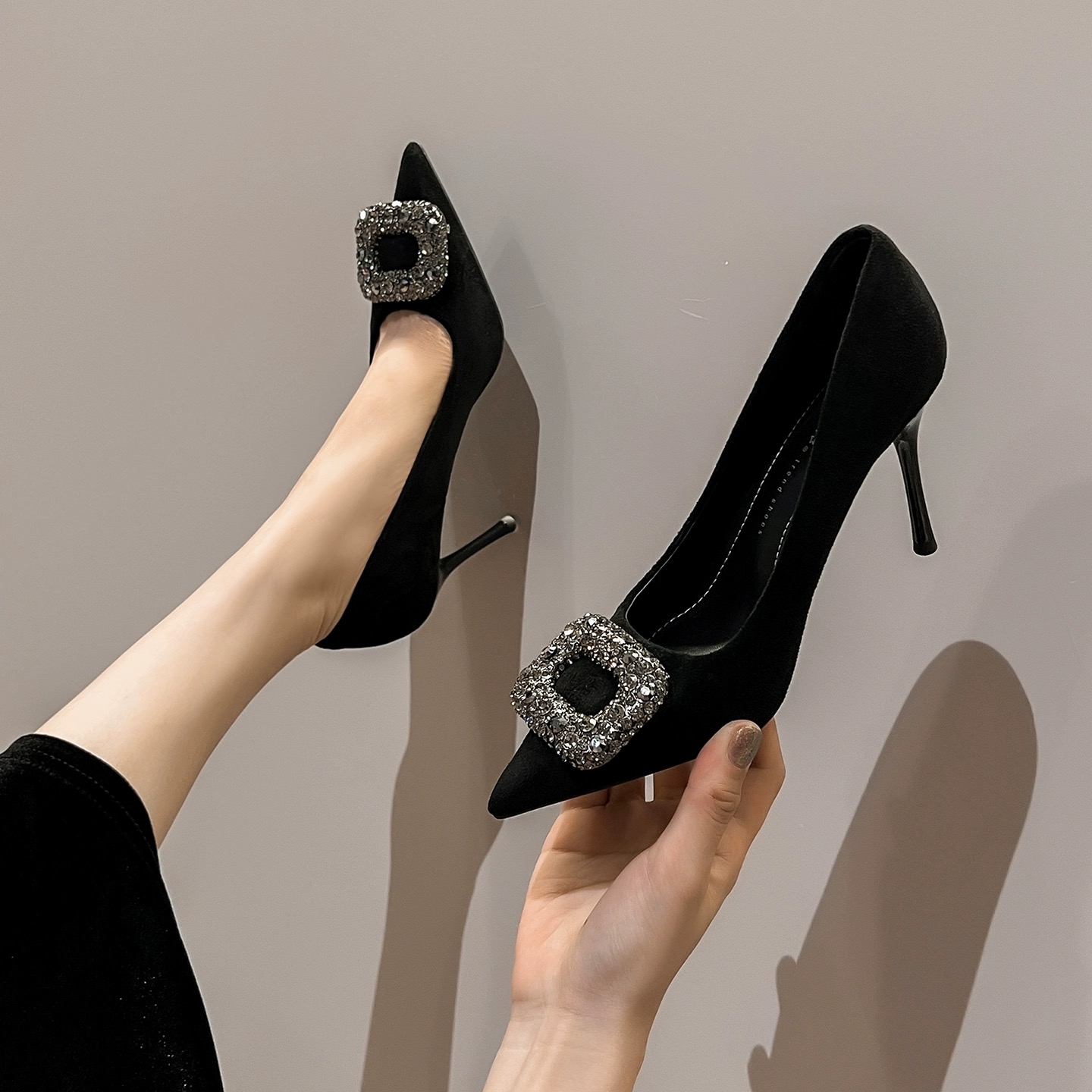 黑色高跟鞋女气质高级不累脚2026年新款春绝美水钻细跟职业单鞋女(37码)